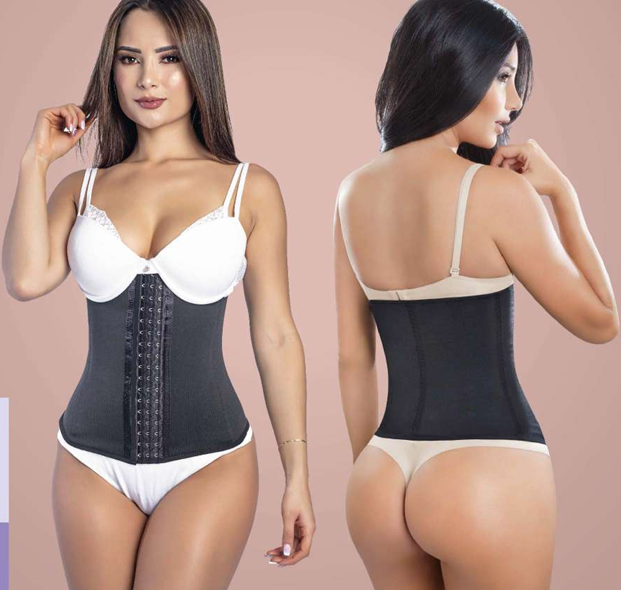 Cubrimiento total de la zona abdominal con alta compresión que controla y moldea abdomen, cintura, espalda y sistema de broche decorado de lujo de 2 y 3 broches, acelera la pérdida de peso por efectos de la acción térmica.